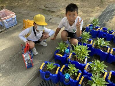 2年生が生活科で、パンジーの苗を鉢に植えていました。色とりどりのパンジーが並べられました。これから、水やりが楽しみです。